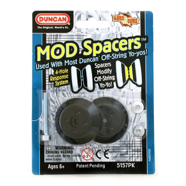 MOD Spacers™ can be installed in most Duncan® Hardcore yo-yos changing the shape, profile, and response system in minutes. Originally developed for the Pro Z™ yo-yo, MOD Spacers also fit in yo-yos like Freehand, FH Zero, Bumblebee, and more! The off-string version can update your Hayabusa, Flying Panda, Throwmonkey and more to a wider shape & 4 hole response system!